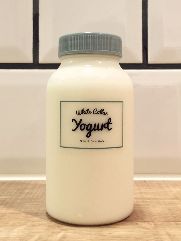wcy_bottle01 2017年7月29日 631 × 842 【White Collar Yogurt】ショップツール 制作事例 : 商品パッケージ / White Collar Yogurt 飲むヨーグルト用ボトル/ボトルラベル デザイン事例1 飲むヨーグルト用ボトルなどに使用するラベルのデザイン。透明シールを使用したデザイン。