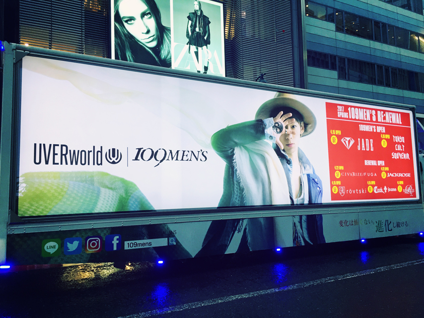UVER01_5 2017年8月10日 842 × 631 【UVERworld | 109MEN’S】2017 Spring 制作事例 : OOH UVERworld | 109MEN’S 2017 SPRING 109MEN’S RE:NEWAL/後半アドトラック(夜)実施事例01