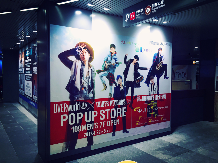 UVER_BIG4 2017年8月10日 842 × 631 【UVERworld | 109MEN’S】2017 Spring 制作事例 : OOH UVERworld | 109MEN’S 2017 SPRING 109MEN’S RE:NEWAL/ポップアップストア告知 駅媒体 田園都市線 渋谷ビッグ4 実施事例