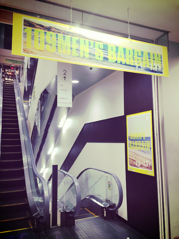 109mens_bargain_16summer01 2016年7月7日 595 × 794 制作事例 2016夏 109MEN’S BARGAIN 天吊り 見た目にスケール感があって、各フロアに吊るされております。