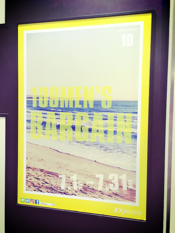 109mens_bargain_16summer03 2016年7月7日 595 × 794 制作事例 2016夏 109MEN’S BARGAIN B1ポスター 文字の大きな案も提出しましたが、落ち着いた印象の案が採用されました。