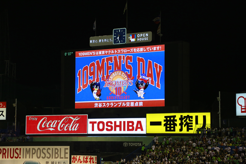 ys_109mensday_160720_03 2016年8月4日 842 × 561 制作事例 制作事例 : バックスクリーン静止画/ 東京ヤクルトスワローズ×109MEN’S| 109MEN’S DAY @Jingu Stadium 2016 今年はミラクルMETSにあやかったカラーリングをチョイスしました。